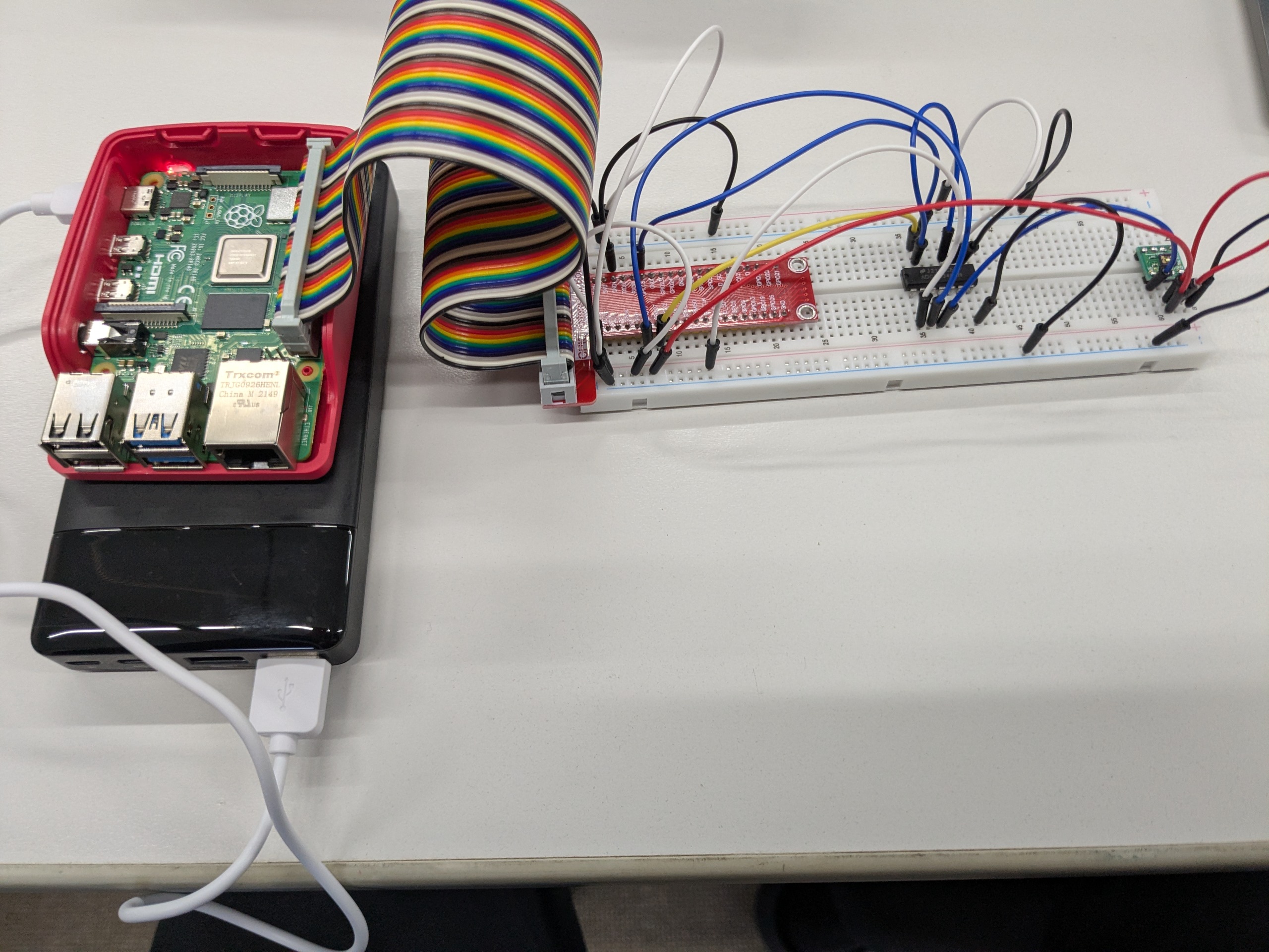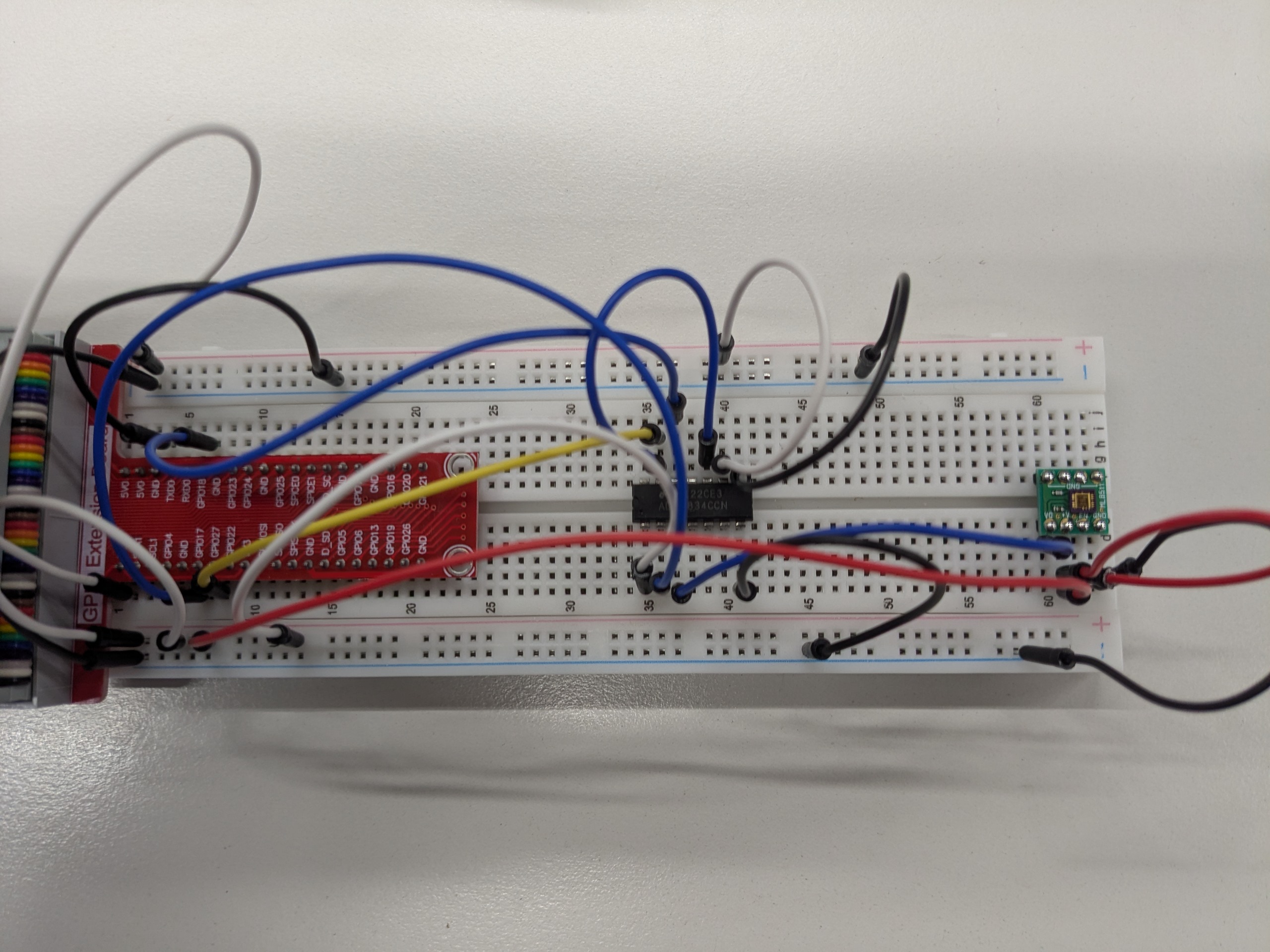 I was personally excited at the mini-project. They were trying to use an analog UV sensor to interface directly with the Raspberry Pi based on the tutorial they found, but that tutorial used an Arduino/Raspberry Pi Pico, which both have onboard analog-to-digital converters. The regular Raspberry Pi doesn’t have that so you need a separate chip to do the conversion. It was lucky that their kit already had the ADC0834, and even luckier that I had already built a circuit that used it - making a wind energy generator (see the other blog post).