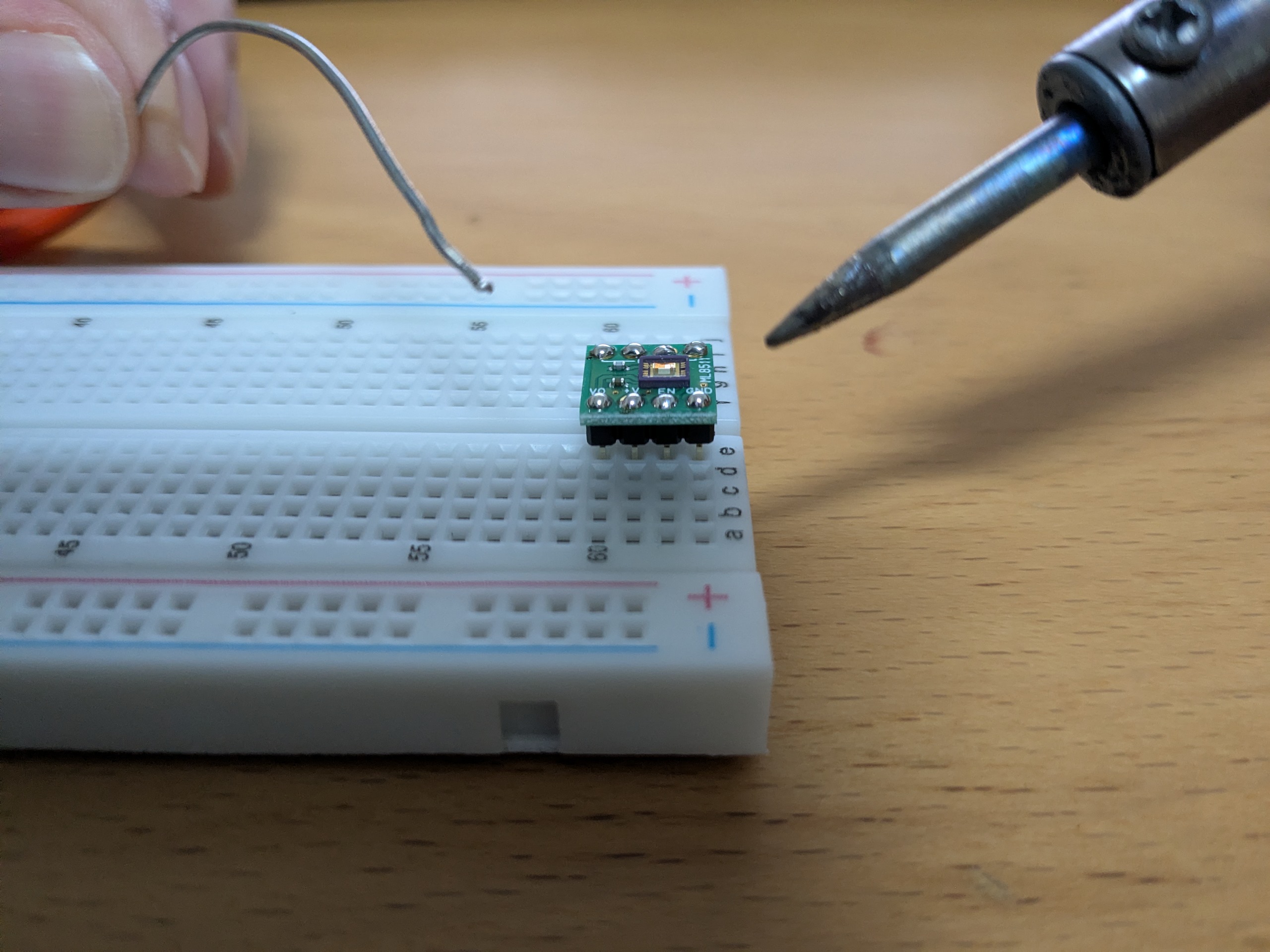 After a weekend afternoon or so of troubleshooting, I wasn’t able to get any reading (it was just a noisy 128, which is half the max analog value that gets read). Turns out the problem was the connection - the ML8511 was sitting on header pins that are plugged into the breadboard, and those pins needed to be soldered. Another piece of luck - I asked around and one of the chemistry teachers had a soldering kit at the school. I bought the kit home, watched some Youtube Videos to refresh memory (I had only soldered once, back in my very first job), and did it after school that same day.